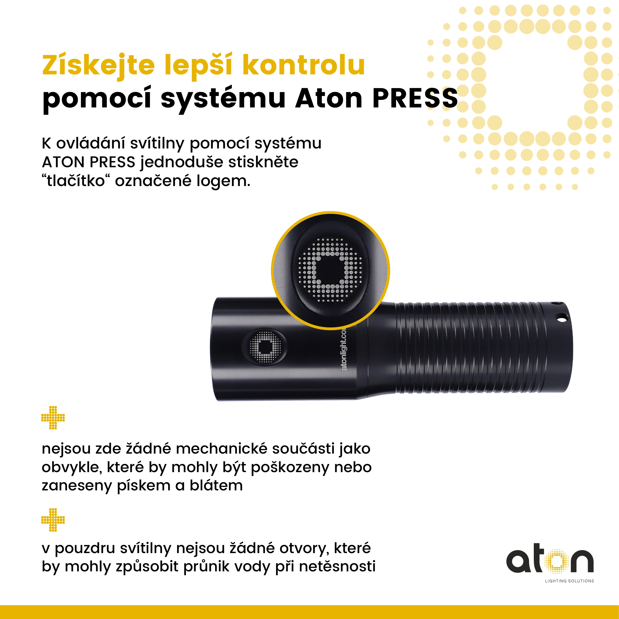 - Aton PRESS system works on the basis of evaluation of micro-deformations at the point of pressing and has no mechanical parts, which could be damaged or clogged with sand and mud